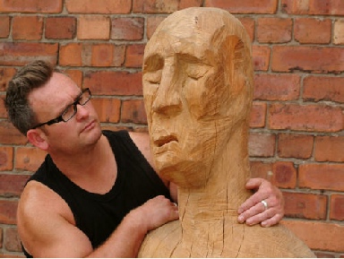 Against The Grain' - expressive wood carving on a large piece of wood, with sculptor Simon Kent.
